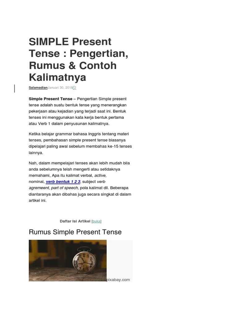 Active voice uses simple present tense 3. (+) my father is a teacher. Hm, kelihatannya sih mudah banget ya, tapi kok ketika soal tenses muncul saat ujian, kamu . Materi bahasa inggris kelas 12 sma · simple present . Contoh simple present tense kalimat positif adalah: Berikut contoh kalimat bahasa inggris simple present tense: Semoga bermanfaat para pembaca sbi!!! 1000 contoh, pengertian, dan rumus kalimat present perfect tense · 1000 contoh cv professional . S + v1 + o = simple present tense. Where at that time were already able to use a form of communication. Artikel bahasa inggris tentang pendidikan beserta tensesnya. Contoh artikel bahasa inggris simple past tense file. Sebuah contoh artikel juga dapat dijadikan acuan tentang bagaimana cara menulis artikel berbahasa inggris yang baik dan benar.